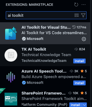 By zainstalować i przetestować modele należy zakładce Extensions wyszukać AI Toolkit for Visual Studio Code.