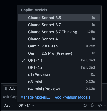 Jest też możliwość dodania jako model w Github Copilot w planie darmowym, by to zrobić należy w liście modeli kliknąć Manage Models