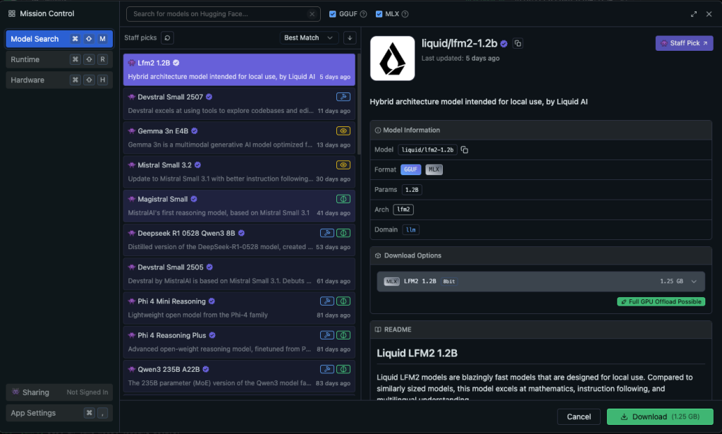 | Formaty modeli | GGUF (wszystkie platformy), MLX (tylko macOS) |