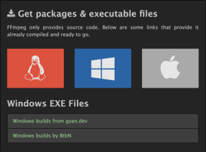 "Windows": "\n\033[94mChocolatey install command:\nchoco install ffmpeg\n\nScoop install command:\nscoop install ffmpeg\033[0m",