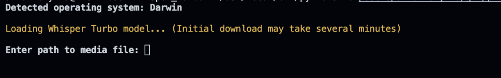 python transcribe_whisper.pyNastąpi wtedy pobranie modelu whisper turbo i po poprawnym pobraniu zostanie wyświetlony komunikat o podaniu ścieżki do filmu gdzie po tym nastąpi transkrypcja.